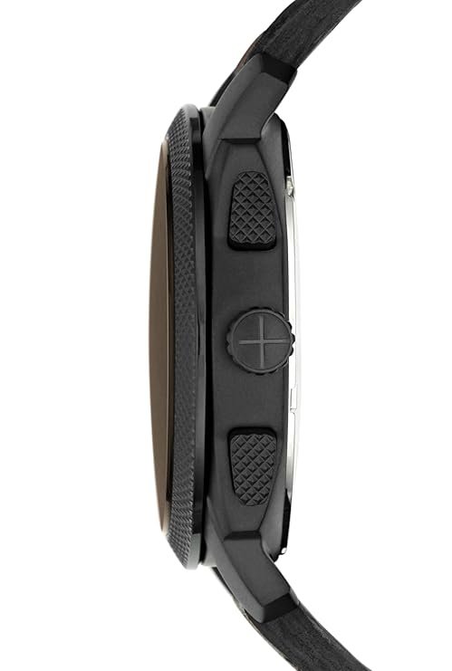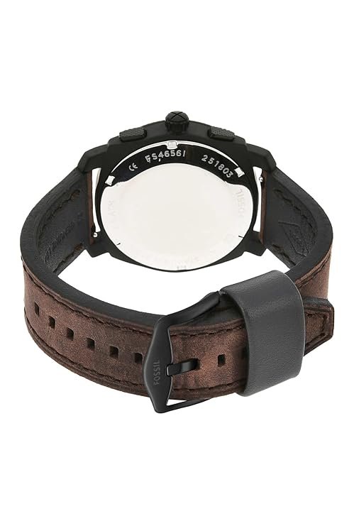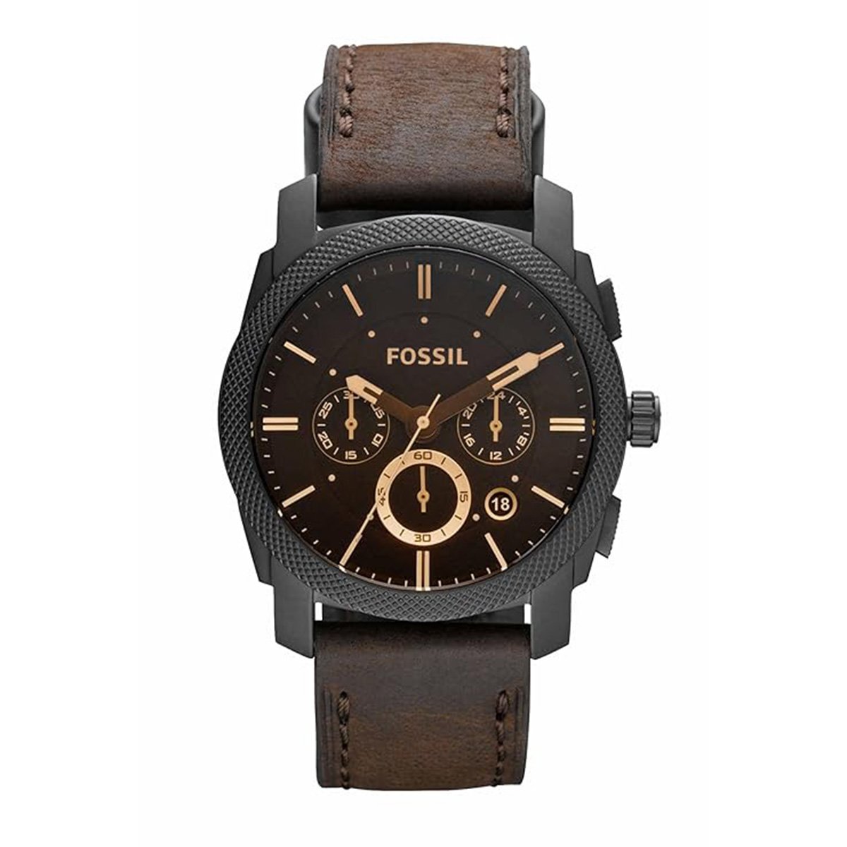 The Fossil FS4656 Machine is a rugged and stylish men’s analog-chronograph watch with a black dial contrasted by a rich brown genuine leather strap. It features a 42 mm stainless-steel case, a quartz movement with chronograph sub-dials, and water resistance up to 5 ATM — making it perfect for casual daily use with a touch of bold character.