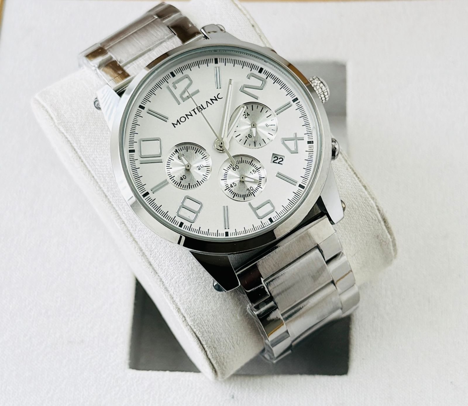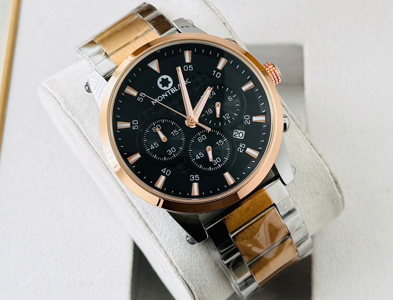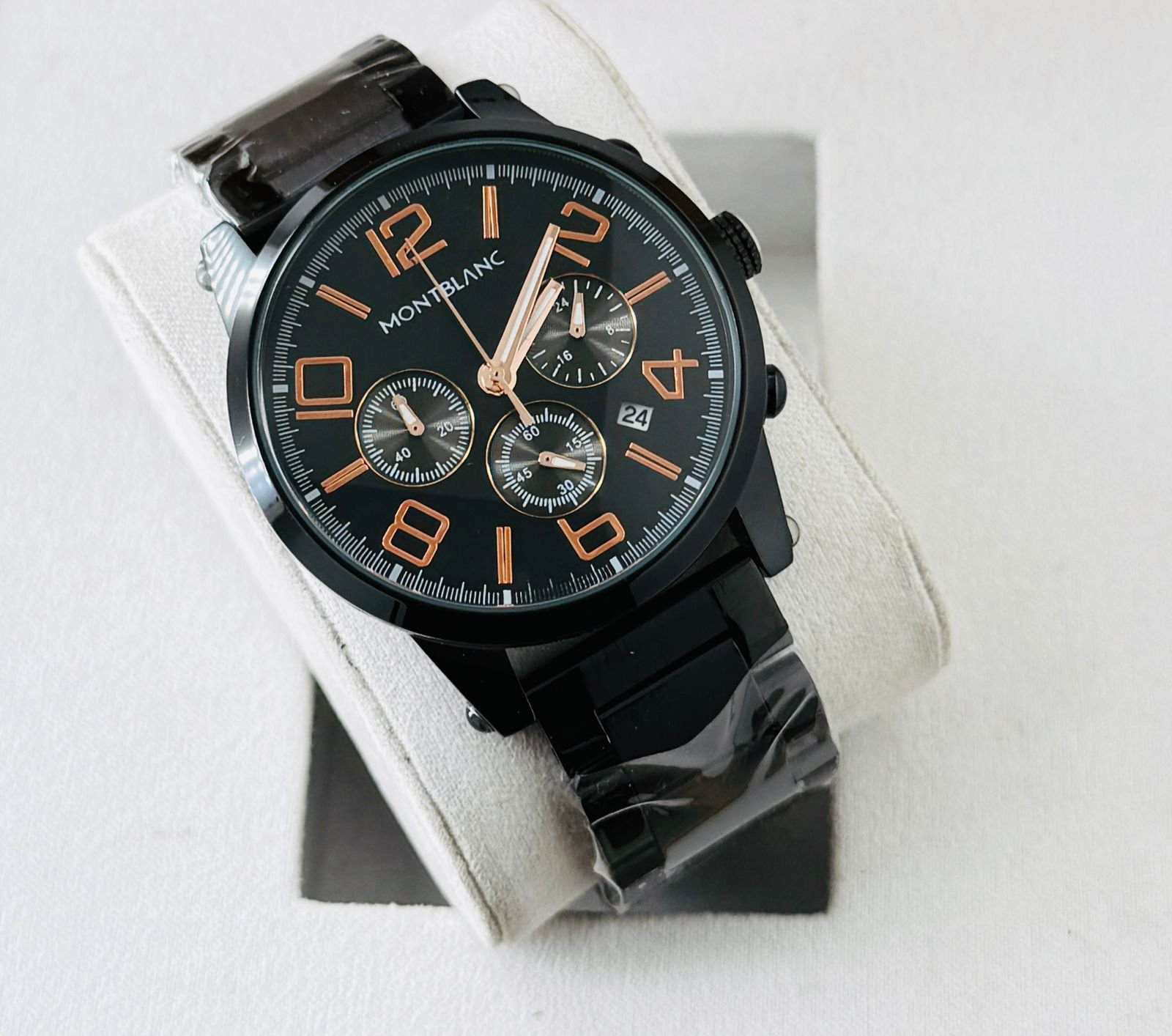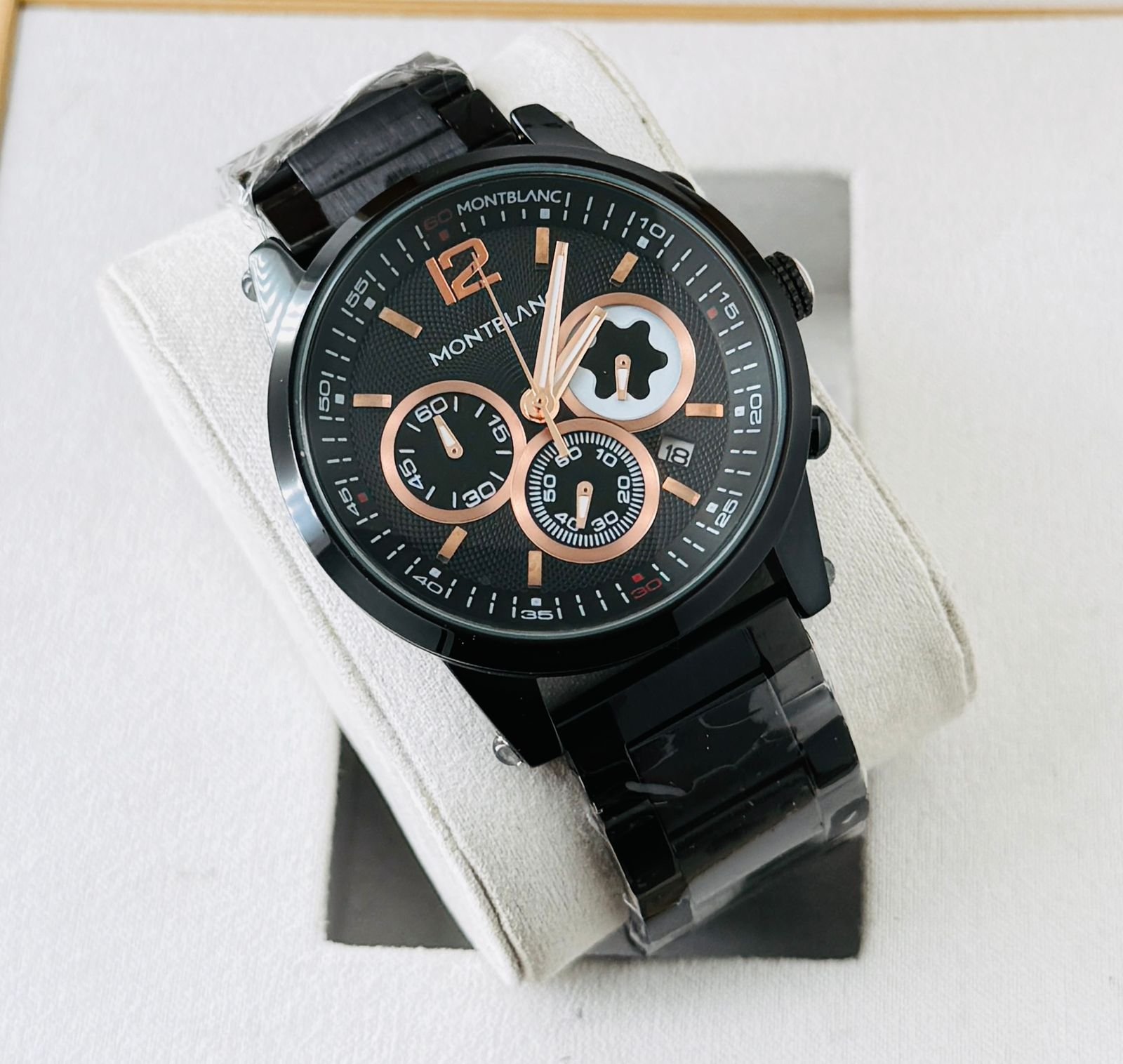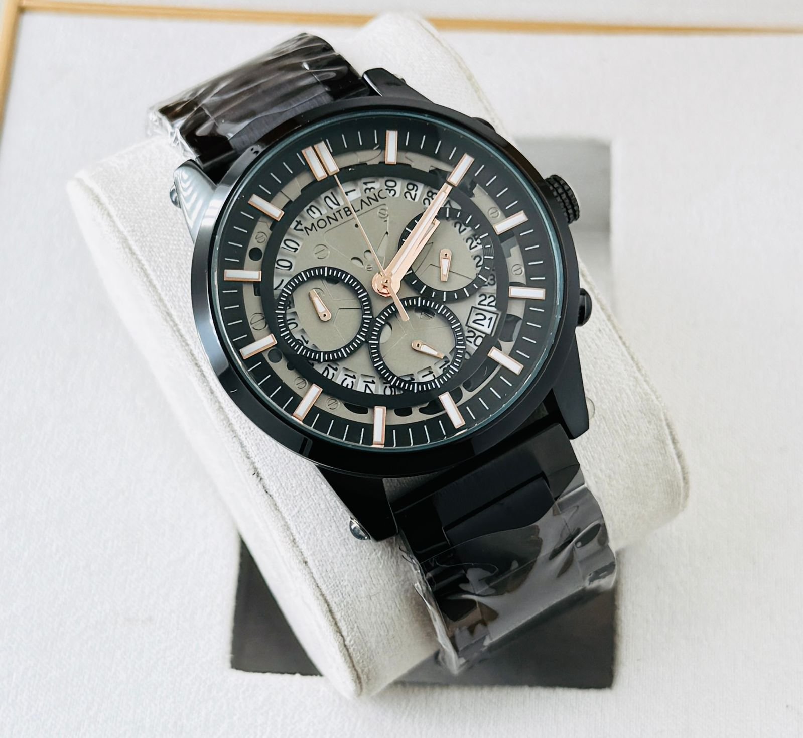 The Montblanc 1858 Chronograph Luxury Edition features a striking skeleton-style chronograph dial with rose-gold accents and a premium black stainless-steel bracelet. Perfect for business, parties and daily premium styling.