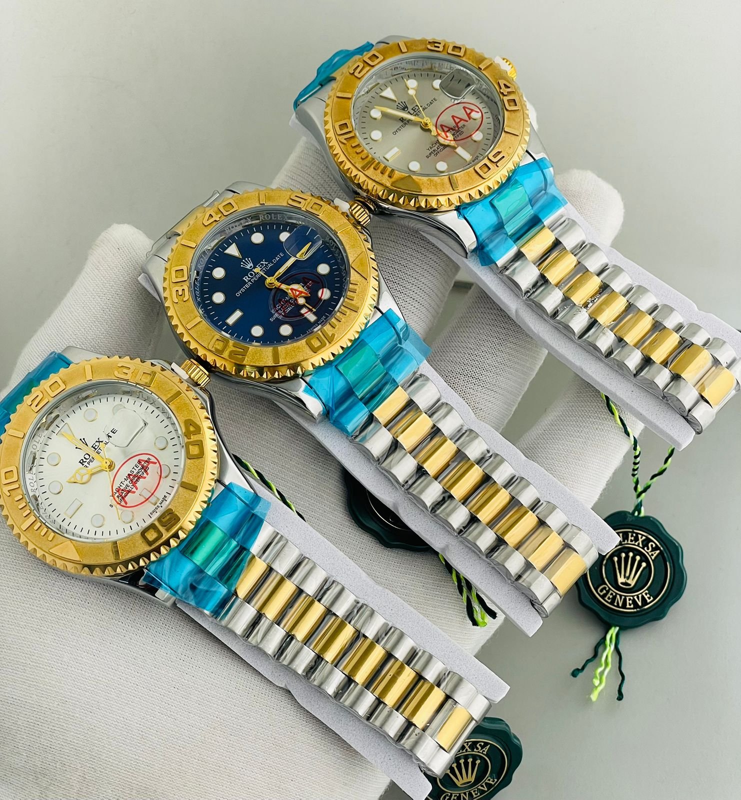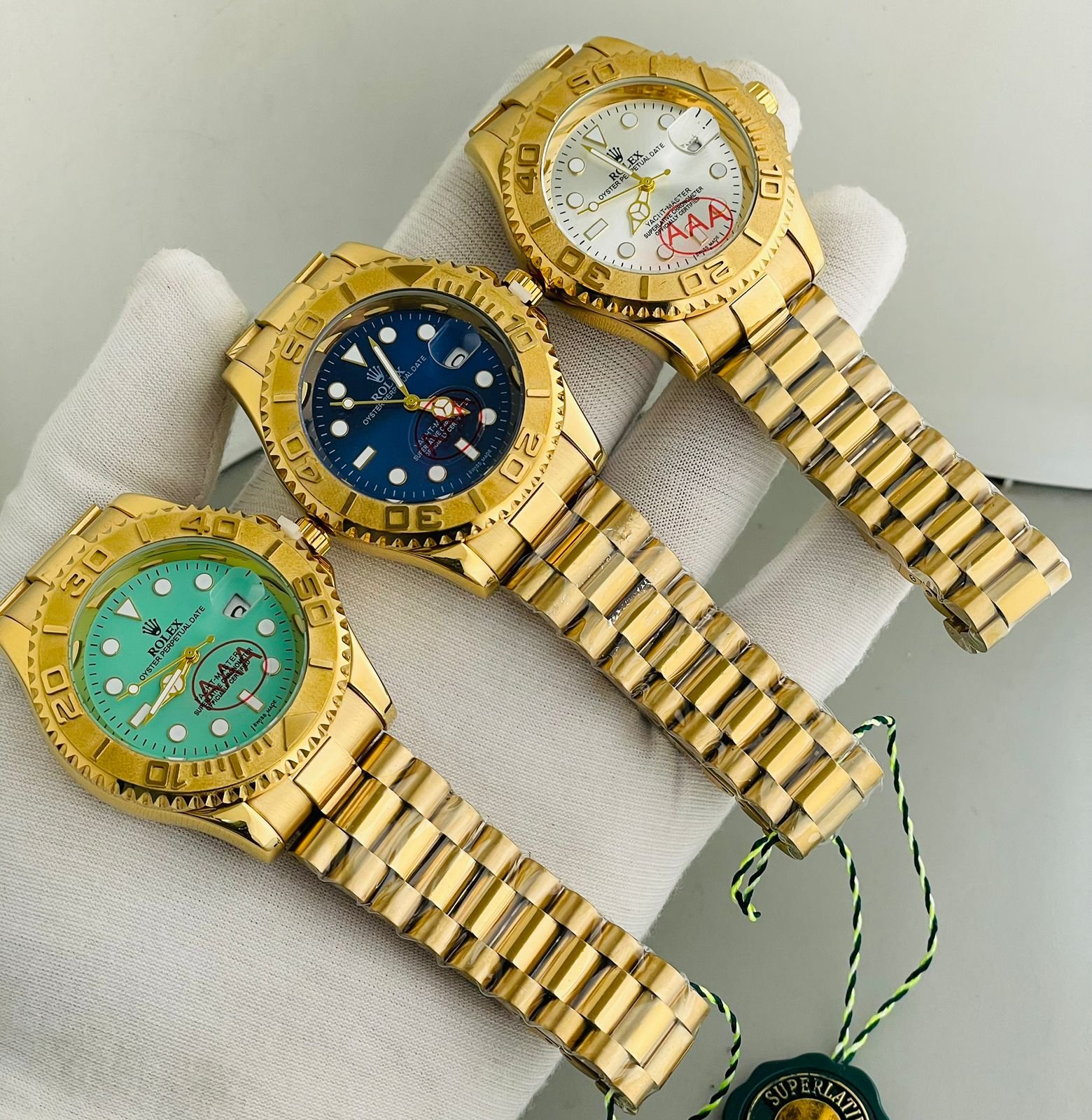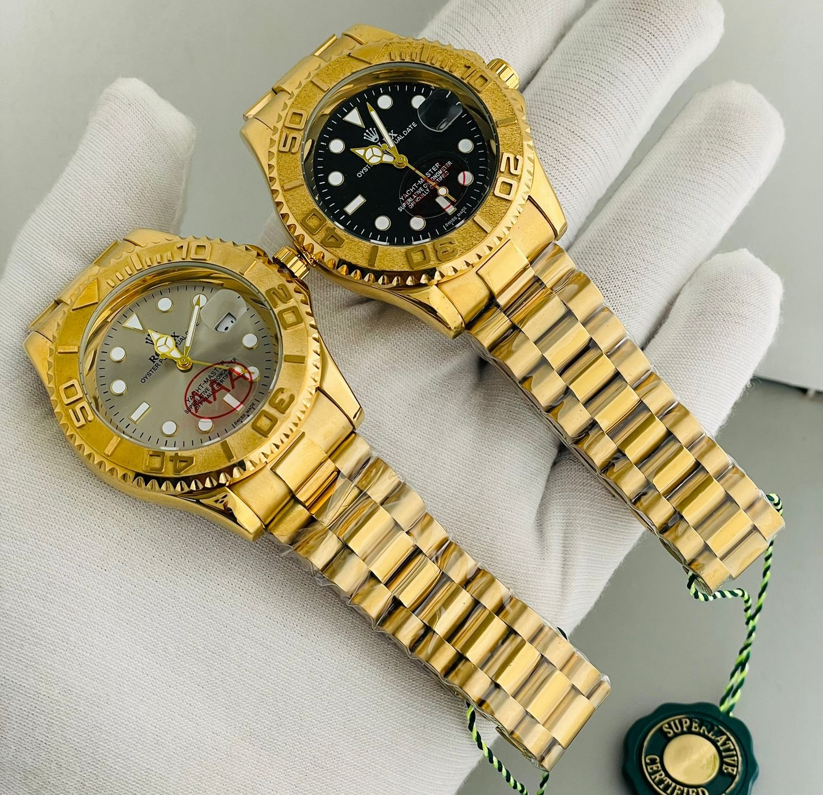 The Yacht Master M46 Sport Edition Watch brings together bold sporty looks with classy luxury styling, making it a perfect pick for fashion-forward men. The iconic rotating bezel gives the watch its strong diver-style character, while the luminous markers ensure clear visibility during day and night. Available in multiple premium finishes like Full Gold & Black Steel, this model suits every personality and every outfit.
